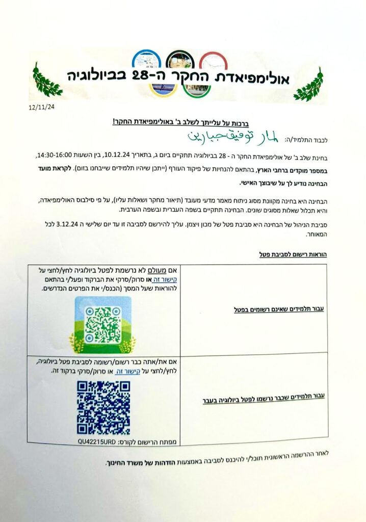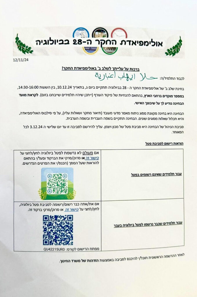 فازت الطالبتان لمار جبارين وحلا اغبارية من الصف الثاني عشر 10 تحت اشراف المربية نورة وليد محاميد في أولمبياد البحث العلمي في البيولوجيا وهي مسابقة مخصصة للطلاب المتفوقين في دراسة علم الأحياء. تهدف المسابقة إلى تعزيز دراسة هذا التخصص على مستوى المدارس وعلى المستوى الوطني. يُطلب من الطلاب المشاركين في المسابقة التعامل مع فهم نصوص بحثية، تطبيق المعرفة السابقة، وإتقان مهارات البحث العلمي. تُعتبر المسابقة مبادرة من قسم الإشراف على تعليم البيولوجيا في وزارة التربية والتعليم، وتُقام سنويًا في جامعة بار-إيلان منذ عام 1998.