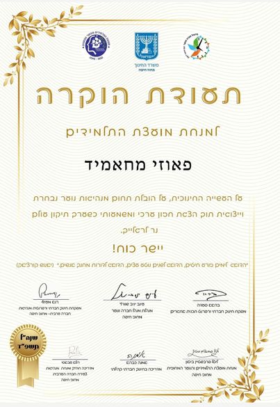 حاز مجلس الطلاب المدرسي على شارة الجودة المهنيّة “אות התקינות” من قبل وزارة التربية وقسم الشبيبة والمجتمع، تقديراً لجهد أعضاء المجلس وإجتهادهم وعملهم الدؤوب والمسؤول والمهني في كافة المجالات، مدرسياً وجماهيرياً.